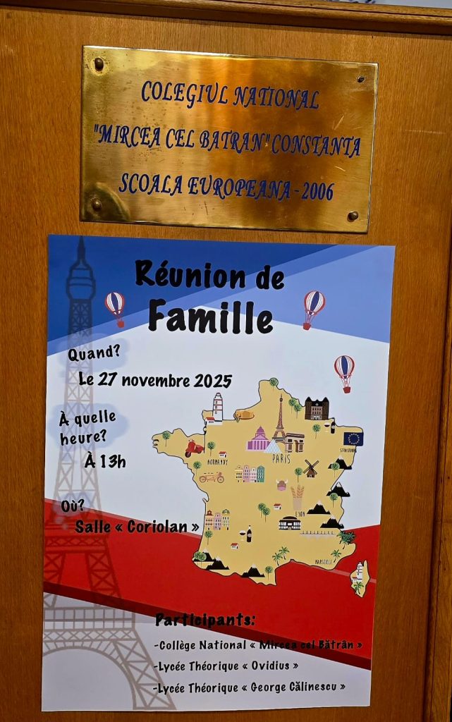 Jeudi 28 novembre, le Collège National « Mircea cel Bătrân » de Constanța a accueilli l’activité « Réunion de famille », un rendez-vous dédié aux élèves de 9ᵉ année en section bilingue français des trois lycées francophones de la ville : le Collège National « Mircea cel Bătrân », le Lycée Théorique « Ovidius » et le Lycée Théorique « George Călinescu ». L’objectif de la rencontre a été de renforcer la communauté francophone locale à travers la collaboration et l’échange.